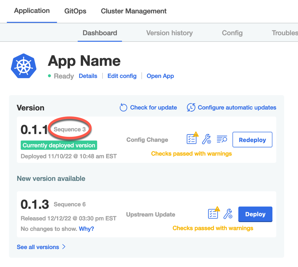 When a new version is available for upgrade (including when KOTS checks for upstream updates, when the user syncs their license, or when the user makes a config change) the KOTS Admin Console assigns a unique instance sequence number to that version. The instance sequence number starts at 0 and increments for each identifier that is returned when a new version is available.